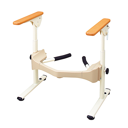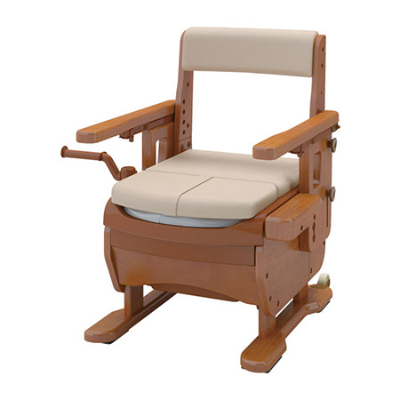 - ポータブルトイレは移乗しやすく、安定して座位が保てるものを選びましょう。アームレストがあり、足が引けて、安定している背もたれのある家具調トイレ。ワンタッチロックで操作がしやすいひじ掛け。