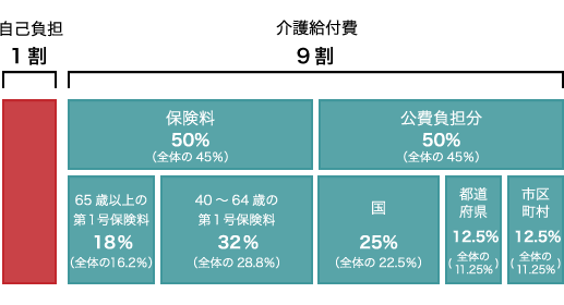 介護給付(実際に利用されたサービスに支払われる費用)は、全体の9割を被保険者の保険料(50%)と国(25%)、都道府県(12.5%)、市区町村(12.5%)の割合で負担し、残り1割はサービスを利用した人の自己負担となります。